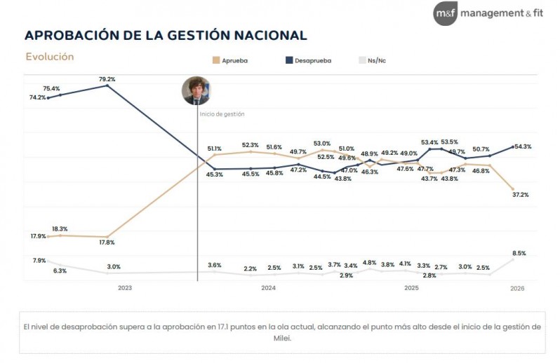 En tanto, la desaprobación de Milei escaló al 54,3 por ciento y es la más alta desde el inicio de su gestión presidencial en los registros de Management & Fit.